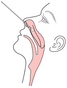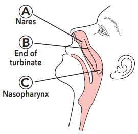 In each case, collect samples by standard clinical methods. Tip the patient’s head back and check to see which nostril has more mucus (head should be inclined from vertical as shown for proper specimen collection). It is important to obtain as much secretion as possible.