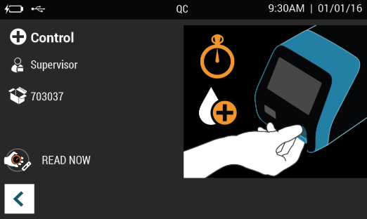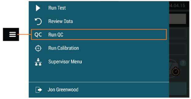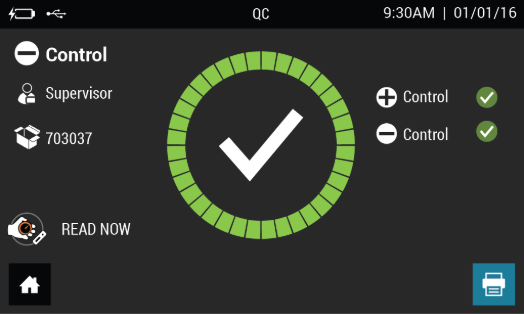 When the positive control is completed, two icons will appear at the bottom of the screen – a »| and a >. Pressing > will take you to the next step, which is to complete the negative control. Pressing »| will skip the negative control, canceling the QC. If this happens, you will need to begin the QC process again from step 1.-