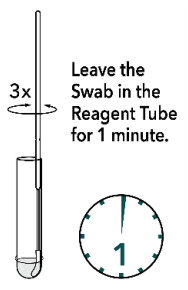 Place the swab sample into the Reagent Tube for one minute. Roll the swab at least 3 times while pressing the head against the bottom and side of the Reagent Tube.