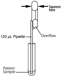 Fill the provided Small, Clear 120 uL Fixed Volume Pipette with patient sample from the Reagent Tube. To fill the Fixed Volume Pipette with pateint sample: