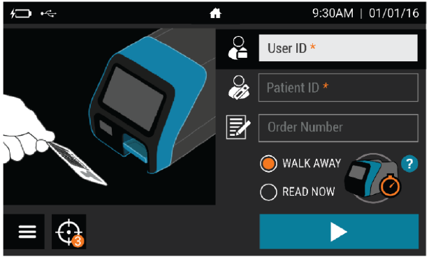 Use the Barcode Scanner to scan an order # barcode from a patient test requisition or other source or tap Order ID field to manually enter the data using the onscreen keyboard on Sofia 2.