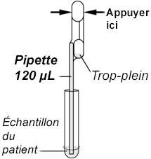 Remplir la petite pipette transparente à volume fixe de 120 µL fournie avec l'échantillon du patient provenant du tube de réactif. Pour remplir la pipette à volume fixe avec l'échantillon du patient :