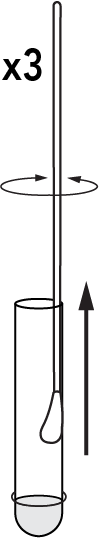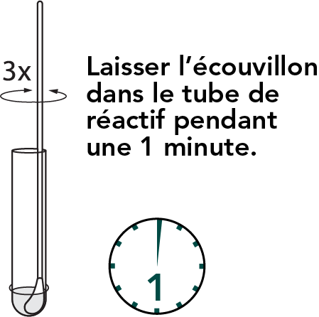 Placer l'écouvillon du patient dans le tube de réactif. Faire tourner l'écouvillon au moins 3 fois en appuyant la tête contre le fond et la paroi du tube de réactif. Laisser l'écouvillon dans le tube de réactif pendant une 1 minute.